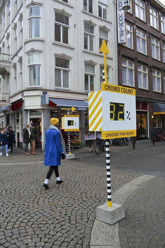 Op het kruispunt tussen een beroemde overbelaste straat (de Damstraat) met een rustigere, maar eveneens interessante route, De Nes: gedurende drie vrijdagen zijn verschillende routekeuze-beinvloeders getest: alternatieve bewegwijzering, informatie over de drukte en een gekleurd patroon op de stoep.